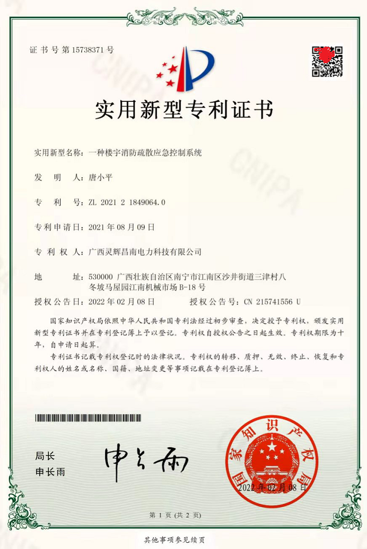 一種樓宇消防疏散應(yīng)急控制系統(tǒng)(實(shí)用新型專(zhuān)利證書(shū))