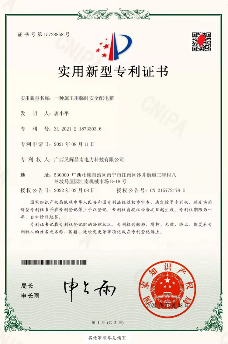 一種施工用臨時(shí)安全配電箱(實(shí)用新型專(zhuān)利證書(shū))