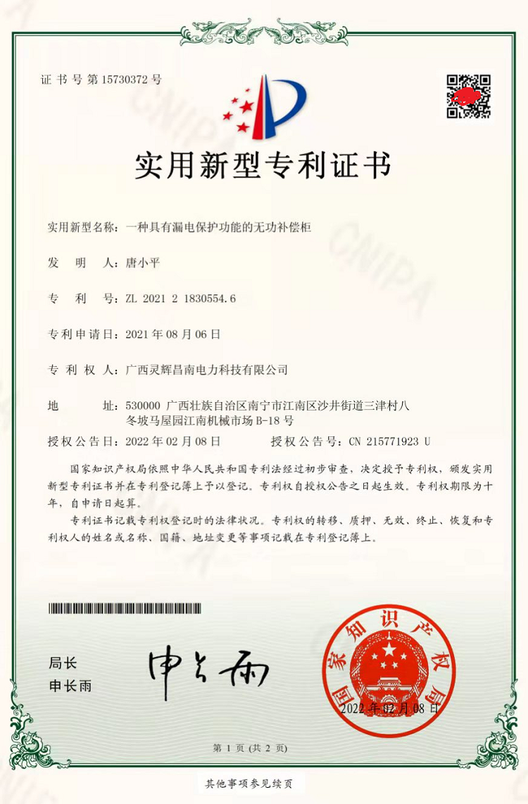一種具有漏電保護(hù)功能的無(wú)功補(bǔ)償柜(實(shí)用新型專(zhuān)利證書(shū))