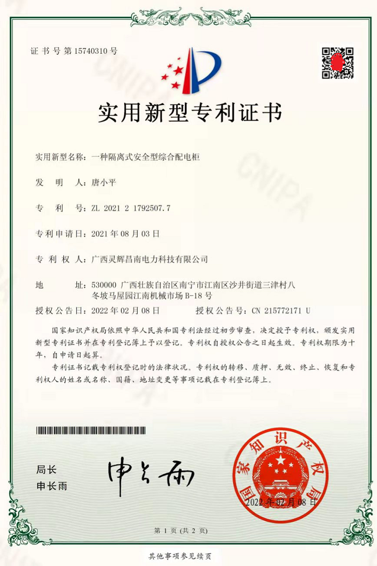 一種隔離式安全型綜合配電柜(實(shí)用新型專(zhuān)利證書(shū))
