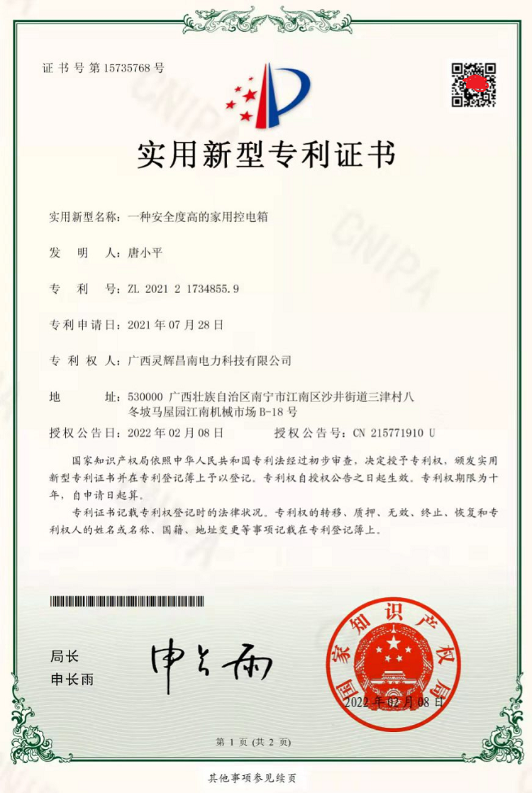 一種安全度高的家用控電箱(實(shí)用新型專(zhuān)利證書(shū))
