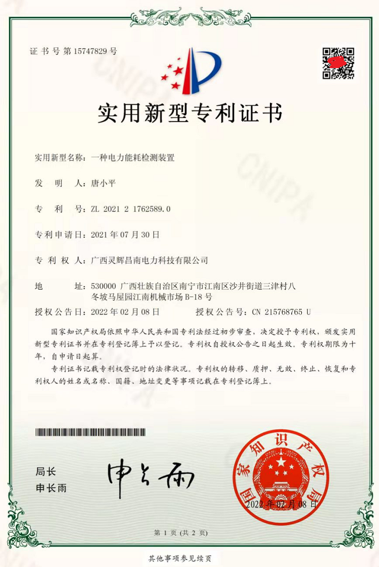 一種電力能耗檢測(cè)裝置(實(shí)用新型專(zhuān)利證書(shū))