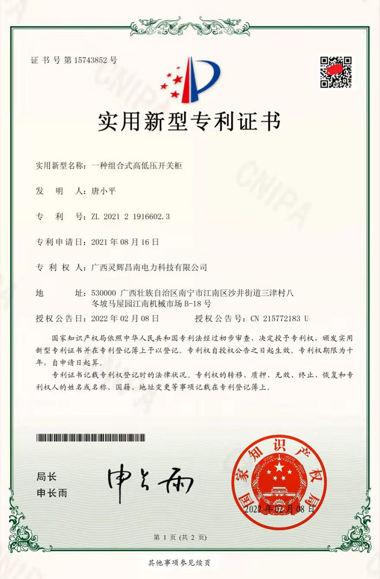 一種組合式高低開(kāi)關(guān)柜(實(shí)用新型專(zhuān)利證書(shū))