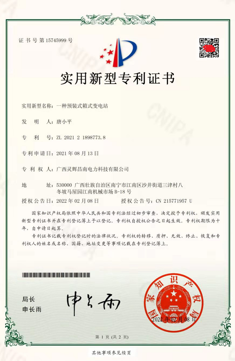 一種預(yù)裝式箱式變電站(實(shí)用新型專(zhuān)利證書(shū))